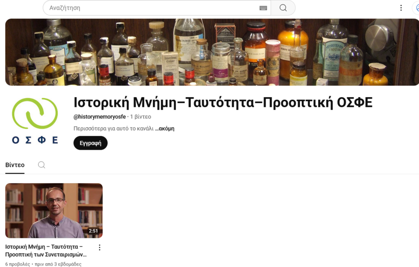 Το κανάλι του προγράμματος «Μνήμη, Ταυτότητα & Προοπτική των Συνεταιρισμών Φαρμακοποιών» στο Youtube(https://www.youtube.com/@historymemoryosfe)